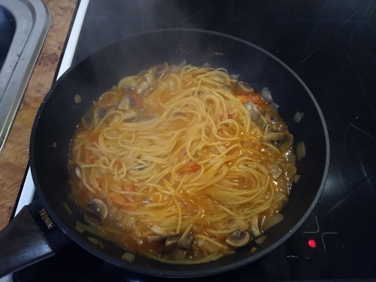 Тем временем наши овощи крепко поджарились, грибы немного уменьшились и пустили сок, так или иначе разгребаем овощи в стороны, и кладем 160 грамм (2 порции) спагетти прямо на сковороду.