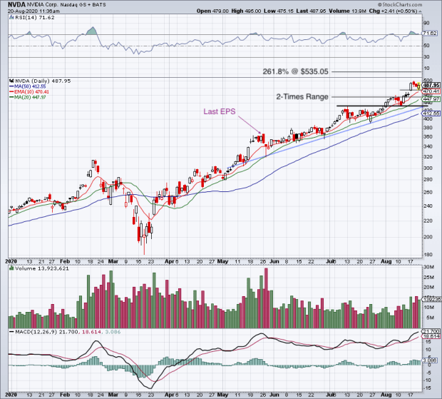 | Nvidia Report Was Robust - Here's How to Trade the Stock Posted: 20 Aug 2020 09:45 AM PDT Nvidia reported better-than-expected earnings and above-consensus guidance, yet the stock isn't rallying. Here's how to trade it now. Another quarter, another blowout quarterly result from Nvidia (NVDA) - Get Report - although you wouldn't know it with the shares about flat on the day. At a time when businesses are struggling due to the coronavirus, a handful of names are doing well. Chipmakers Advanced Micro Devices (AMD) - Get Report and Nvidia are two of the names doing well in this environment. Nvidia's earnings of $2.18 a share beat expectations of $1.98, while revenue grew 50% year-over-year to $3.87 billion. That figure easily topped expectations for $3.65 billion. Even better was the guidance. Management expects revenue of about $4.4 billion, well ahead of consensus estimates at $3.97 billion. So why isn't the stock up? Better-than-expected results and strong guidance are usually a recipe for a move higher. But with the strong rally ahead of the print, the stock is having a difficult time rallying. Nvidia and AMD are holdings in Jim Cramer's Action Alerts PLUS member club. Want to be alerted before Jim Cramer buys or sells NDA or AMD? Learn more now. Trading Nvidia Stock![]() From the March low to the close ahead of Nvidia's May earnings report, the shares rallied 94%. From there, the stock endured a minor dip before again going on a heady rally. In fact, the shares rallied another 51% from the post-earnings low in May to the most recent report. Altogether, Nvidia shares were up almost 170% from the March low into Wednesday evening's quarterly results. To say that expectations were high may be an understatement, and the muted Thursday response to the strong results may reiterate that point. That's not to say, however, it's time to take off our bull hats and put on the bear suits. After all, the stock is not down 10% on worse-than-expected results. So we can't and we shouldn't get overly bearish until there is a reason to do so. From here: If Nvidia holds this week's low at $472.69 and the 10-day moving average, it keeps $500-plus in play. Over $500 and the 261.8% extension at $535 will be on traders' radar. A close below this week's low puts the two-times range extension in play near $450 and the 20-day moving average. If buyers fail to elevate Nvidia from there, it puts the $432 level in play, followed by the 50-day moving average. |