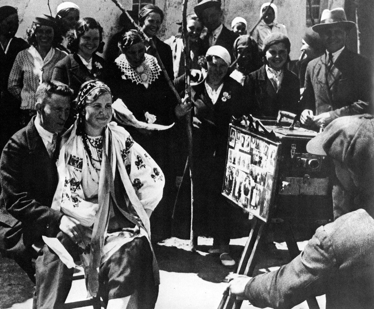 Дорогие любители старых фотографий! Помогите разобраться :) В сети гуляет вот эта фотография с подписью "Колхозная свадьба, СССР, 1938 год". Я очень интересуюсь свадебной фотографией и фото, где запечатлен момент съемки — бесценно. Но! Автора снимка я не нашла, точного места тоже. В сети эта фотография появляется в 2013 году (https://1904loghouse.wordpress.com/2013/09/27/the–schienenzeppelin/), там сказано, что из Facebook взята, затем идет в русском жж уже как колхозная (https://humus.livejournal.com/3325016.html). Невеста на фото одета украинкой. Люди вокруг выглядят очень преуспевающими для колхоза 1930–х годов. И, насколько я знаю, кочующие фотографы — мне кажется, это такой частный предприниматель, вон у него рекламные снимочки на ящике налеплены — в Советском Союзе были редки, разве что на курортах их можно было встретить. А вот в межвоенной Польше — сколько угодно (доказательство — количество фотографий в Восточной и Западной Беларуси в 1921–1939 году — http://veha.by/dw). Одним словом, моя догадка в том, что никакой это не СССР, а снято на территории современной Украины, входивших на тот момент в Польшу или Румынию. Может быть кто–нибудь знает что–то про фотографию или может по деталям дополнить картину? П.С. 1000 извинений, если сочтете неформатом, но ужасно бы хотелось разобраться, да и фоточка–то хорошая.