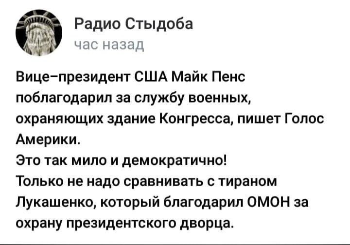 | Posted: 18 Jan 2021 10:16 AM PST ![]() Вице–президент США Майк Пенс поздно вечером в четверг совершил незапланированный визит в Капитолий, где он поблагодарил за службу военных, охраняющих сейчас безопасность в здании Конгресса. Написал xaerostar на mp.d3.ru / комментировать |