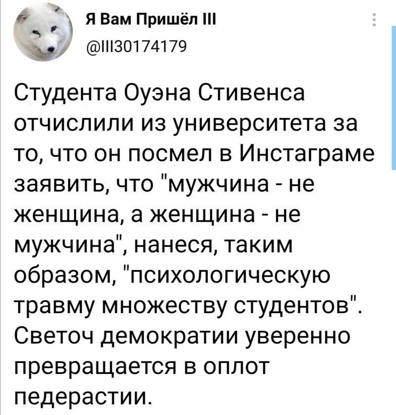 | Новости США: ЛГБТ, не сдавайтесь! Posted: 02 Mar 2021 10:43 AM PST ![]() Колледж в небольшом городке Дженесео при Университете штата Нью–Йорк отстранил одного из студентов от обязательной практики за неподобающие взгляды в соцсетях. Что же такого сказал проштрафившийся Оуэн Стивенс, что ему, по сути, частично запретили учиться? Например, в одной из видеозаписей в своем "Инстаграме" он утверждал: "Мужчина — это мужчина, а женщина — это женщина... И если я мужчина, думающий, что я женщина, то я все равно мужчина... Что бы вы ни чувствовали внутри, это не имеет отношения к вашему биологическому статусу". Он также отказался использовать изобретаемые ЛГБТ–сообществом местоимения, настояв, что право на существование имеют только "он" и "она". Написал xaerostar на mp.d3.ru / комментировать |